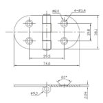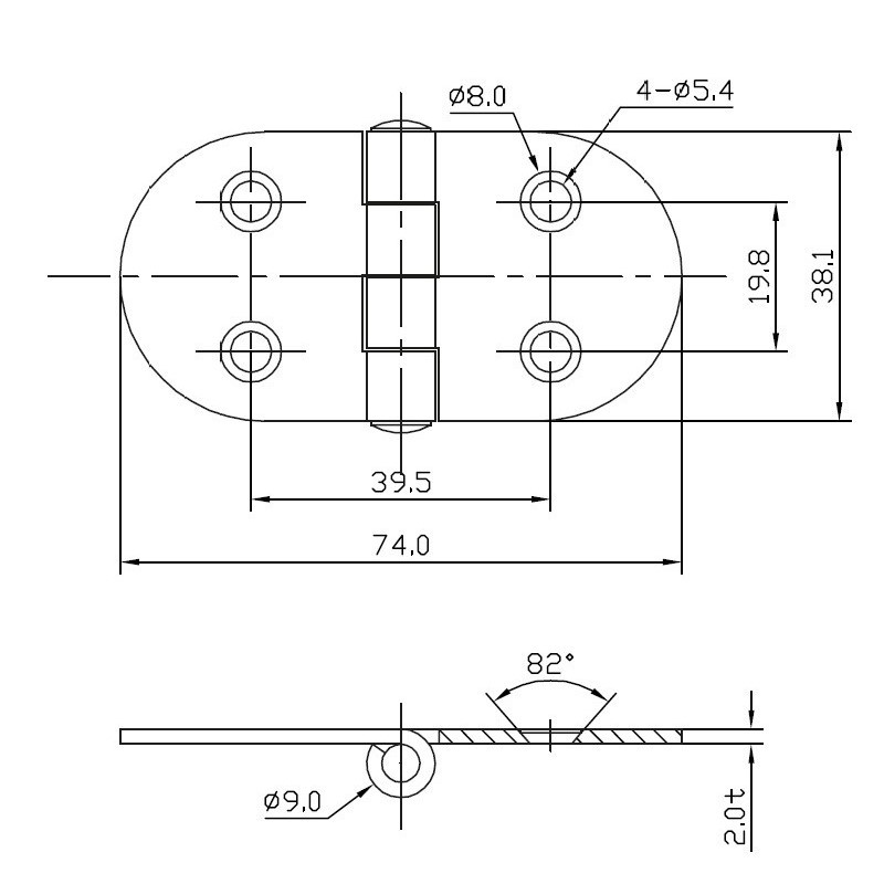 Polished stainless steel hinge; pivot Ø 8 mm, thickness 2 mm. Reversed pin