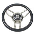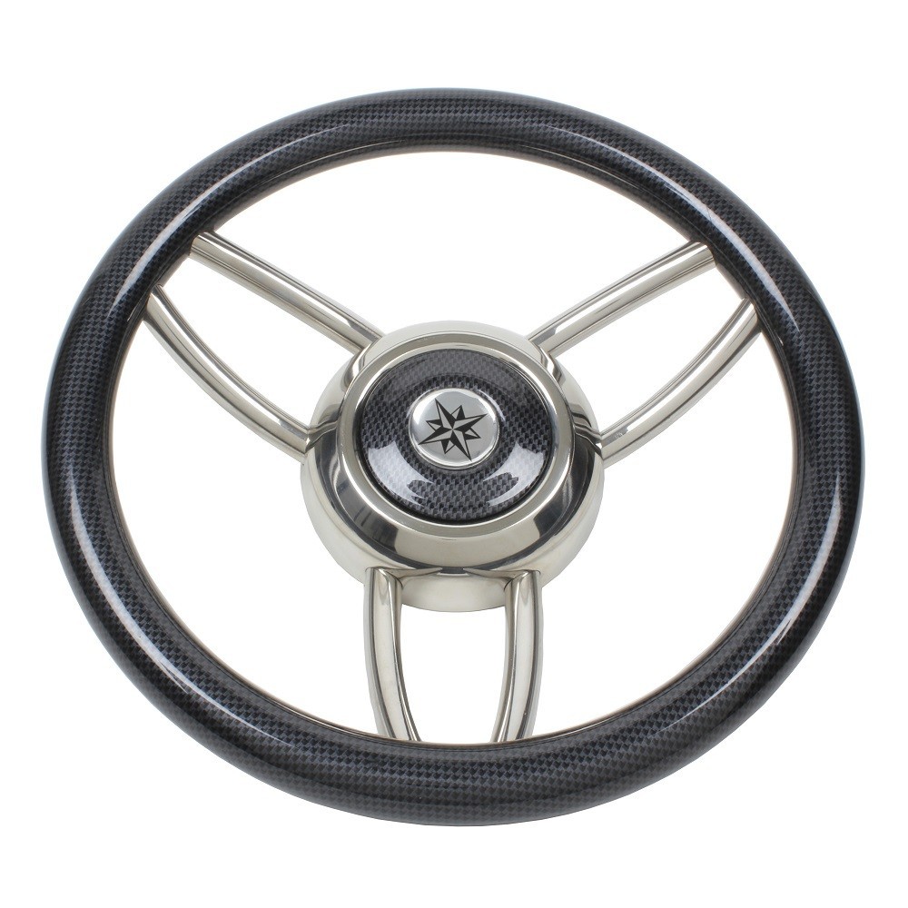 Steering wheel in stainless steel with carbon look handgrip Ø 350 mm.