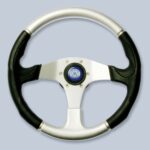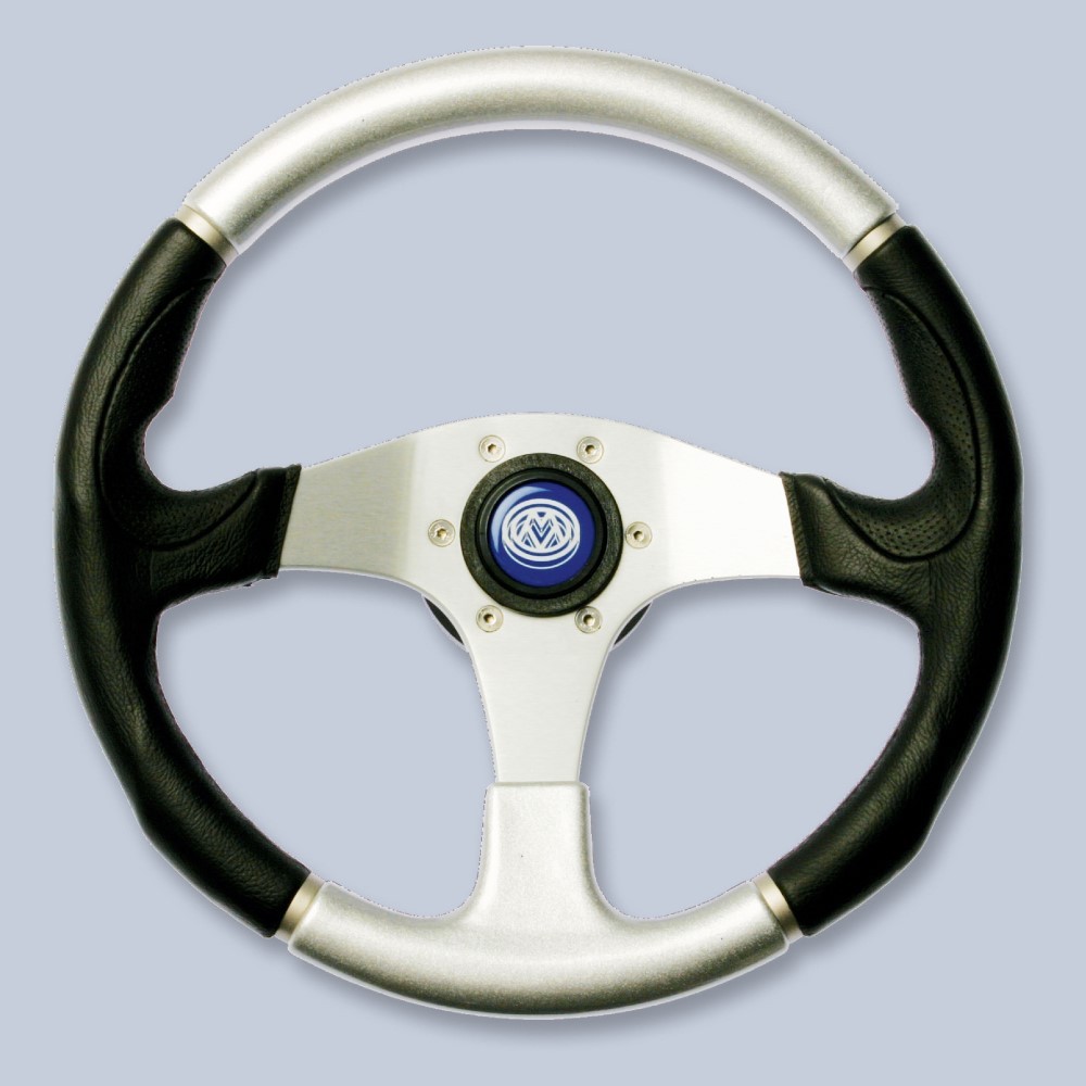 Steering wheel in black polyurethane handgrip and silver painted inserts Ø 350 mm.