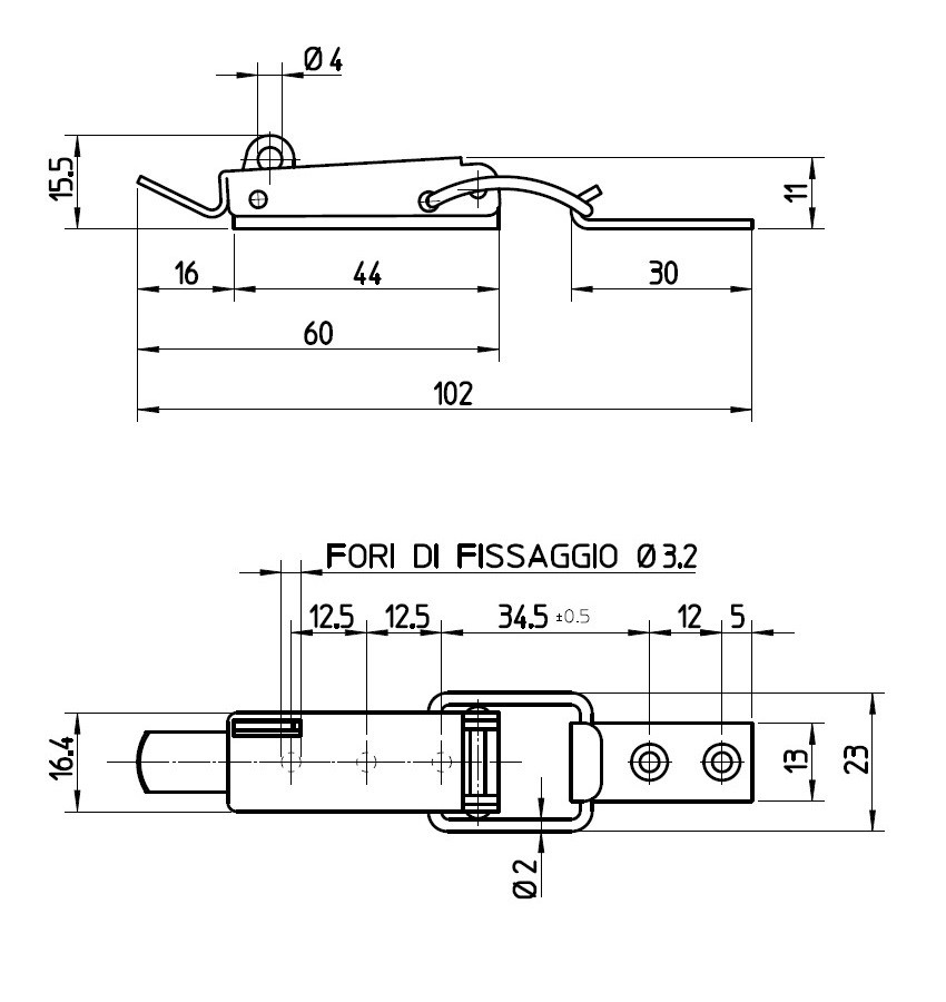 Chiusura a leva in acc. inox con foro per lucchetto. Servono per portelli, boccaporti ed usi similari. 102×23 mm.