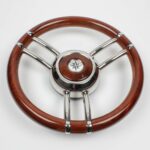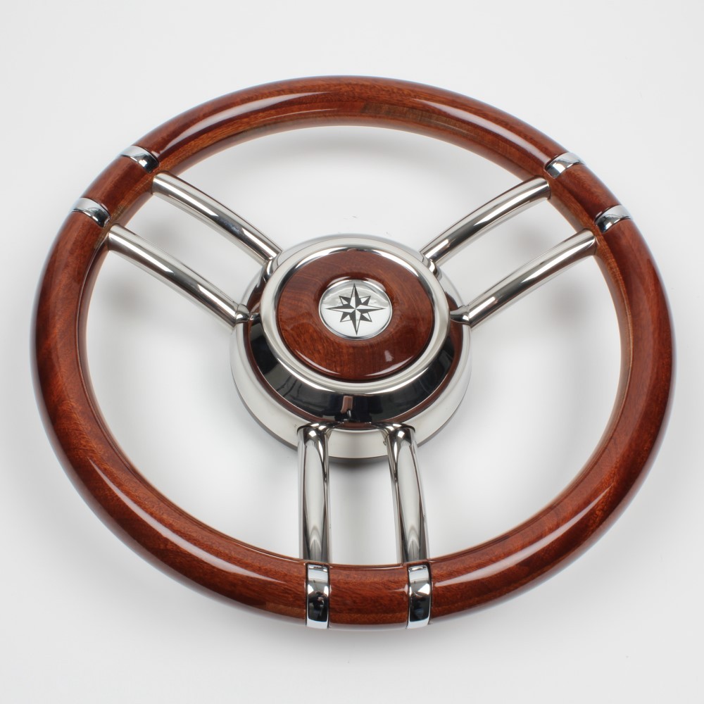 Volante in acciaio inox con impugnatura in mogano Ø 350 mm.